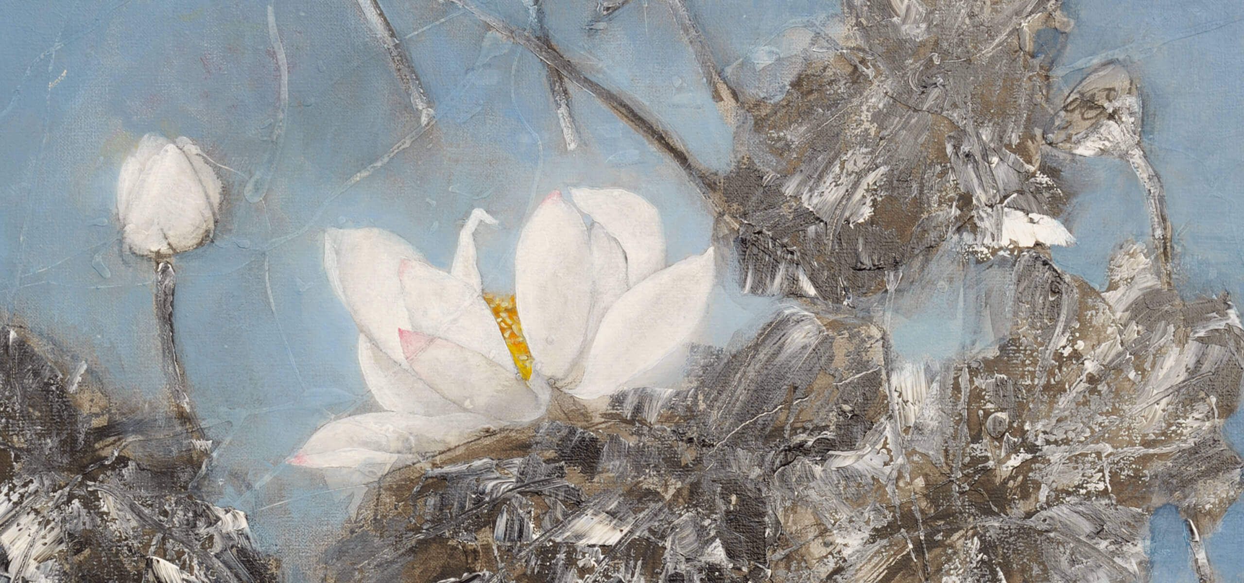 在《莲》系列作品中,荷叶多是灰暗、破碎、残缺的,立于画前,你唯有静默无言,但是内心又不免躁动不安,孤独感油然而生。由《瓶花》向《莲》的进犯,大抵与艺术家的心境契合:按刘明孝老师的说法,自己有多个画室,第一个画室在重庆黄桷坪的“坦克库?重庆当代艺术中心”,“这里是以前军工厂用来装坦克的仓库改建的,画室没有窗户,只有天光。在这里创作很沉得下来,每天一进画室,就像与外面纷扰的世界瞬间失去了联系,全然进入到自己的艺术世界里,这里只有绘画和音乐。”艺术家大部分作品都是在这里完成的;第二个画室位于成都三圣花乡的“荷塘月色画家村”。这里与“坦克库”太不一样,到处鸟语花香,非常休闲。画家村旁边有一片巨大的荷塘,沿荷塘走一圈足有两公里。每年夏天,刘老师都会带着家人来这里度假,和女儿一起去荷塘看荷花、钓鱼、抓青蛙……《莲》的创作正源于这,这番“变故”本不至于此,画中的一片片“残败”也只是些异数。还好大多数荷、莲是充满生机的,不尽完美而已。细想或许艺术家被眼前的景色拽进了“圈套”,心境为之改变,抑或只是一味的描摹状物,全无它意,只是这次进犯、突围着实让观众有些摸不着头脑了。