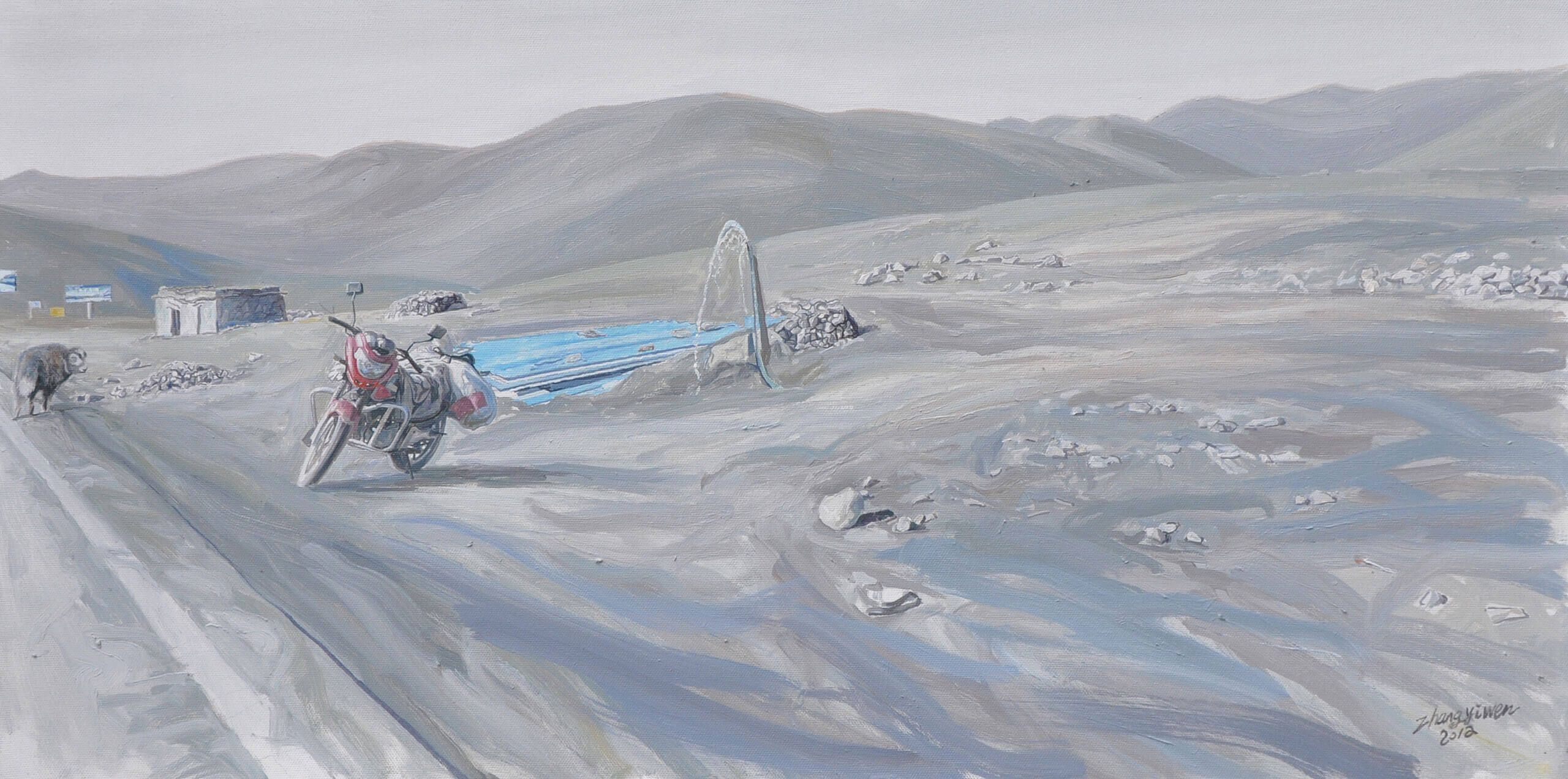 沿318国道,画家张义文走在藏区的公路上。远离大都市,行走在蓝天白云之下,可视野里躲不过的,还是拆拆建建……