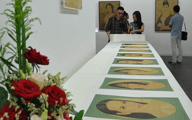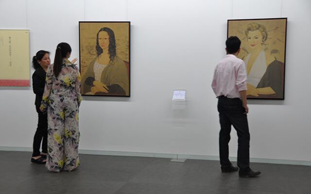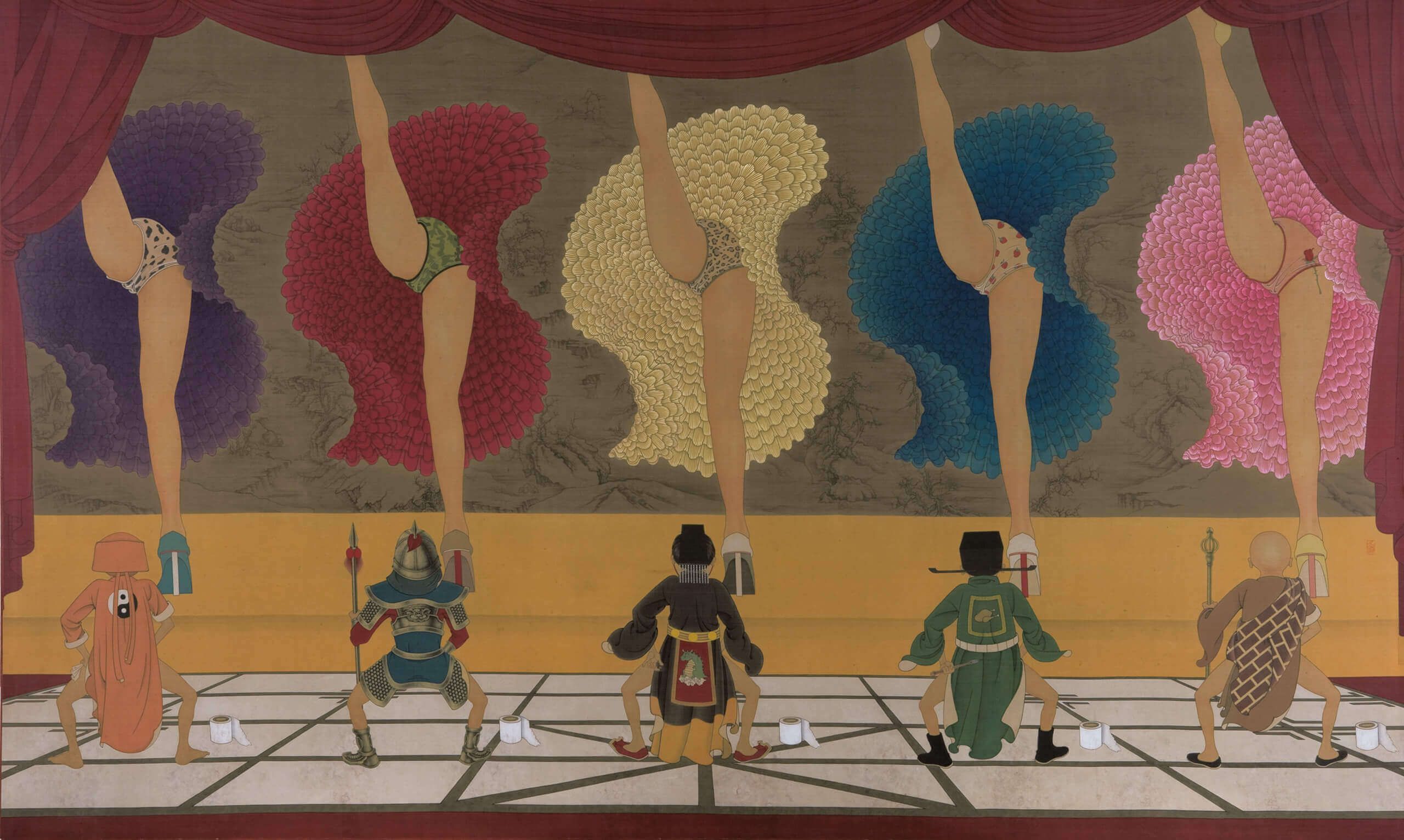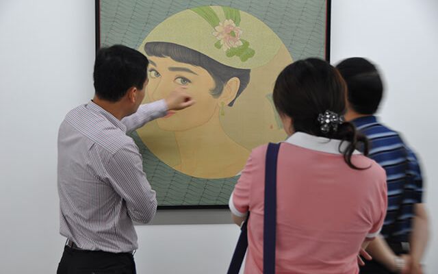 看他的画也有同样的心理过程:熟悉的图像;广为人知的古今中外女明星肖像;中国传统绘画水巾纹;巴黎红磨坊康康舞;艺术家所使用的技法语言;画面中的面孔;存在的场景;讲述的爱情故事;曾经的传统……种种无处不在的,被传统媒体和形形色色的新媒体所制造和传播了无数次的图像,都是我们所熟悉的。