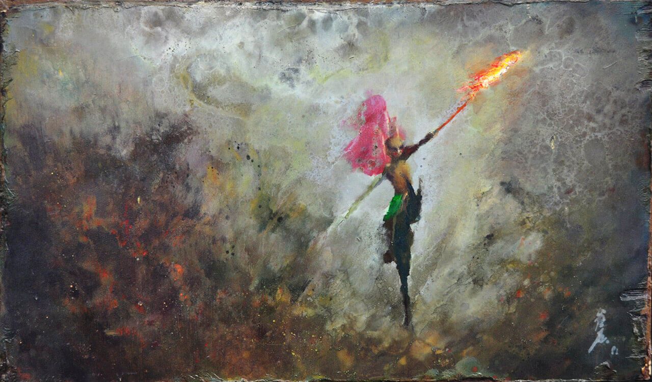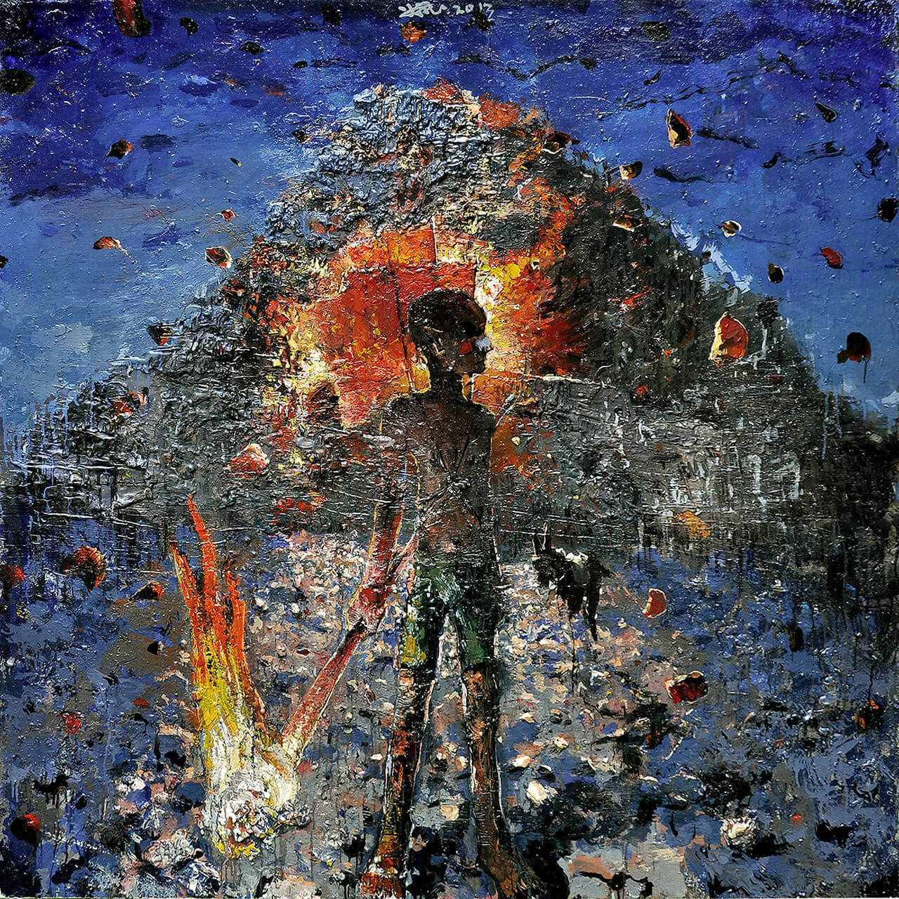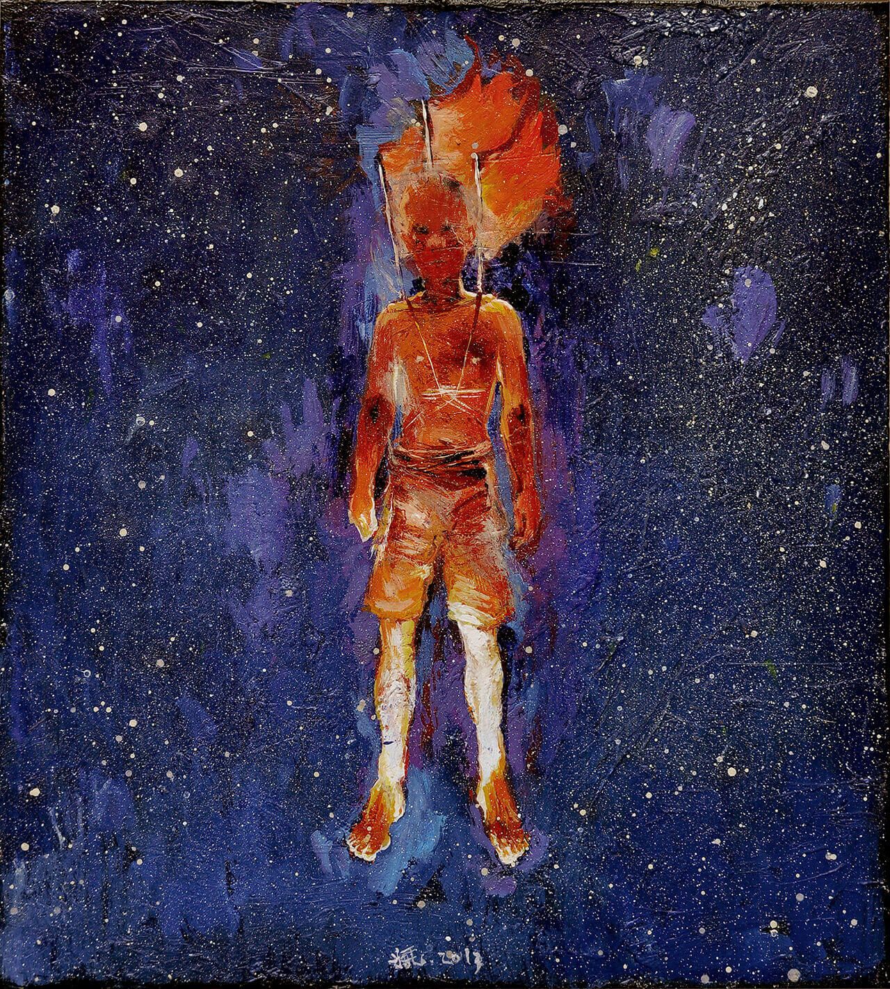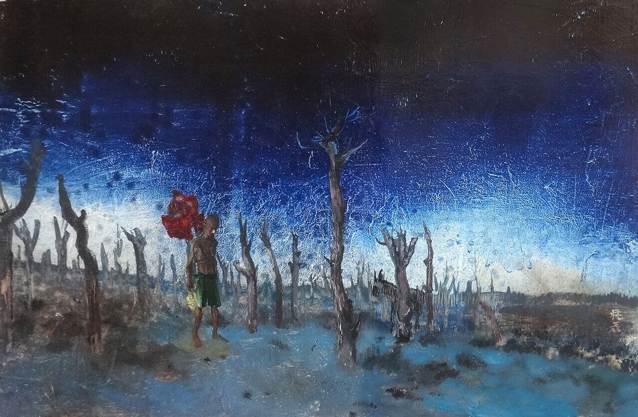 从攻读美术学硕士学位开始,姚磊痴迷并投身于“中国孩子”系列油画创作已经长达5年以上。他的作品有着深邃宽广的隐喻性与强烈的视觉冲击力,其叙事场景多为地域和时代指向都极其模糊的想象空间:在那里,或是群山苍莽、泥淖密布,或是乌云翻滚、雾霭四伏,无论具象场景还是抽象场景,总有一个身背三面小旗、鼻子上一块白粉的男孩在孤独与迷惘当中向着虚无进发。在作品绘制方式上,姚磊采用了汽油燃烧的独特技术。他边烧边画,边画边烧,火焰烤化并引燃油性颜料,形成水墨般自然流淌与相互融和的视觉效果,那些斑驳焦糊的疤痕进一步引发出观看的疼痛与惊惧。这些视觉符号与图像语汇中熊熊燃烧的火焰一起奏响了孤独的荣耀感……