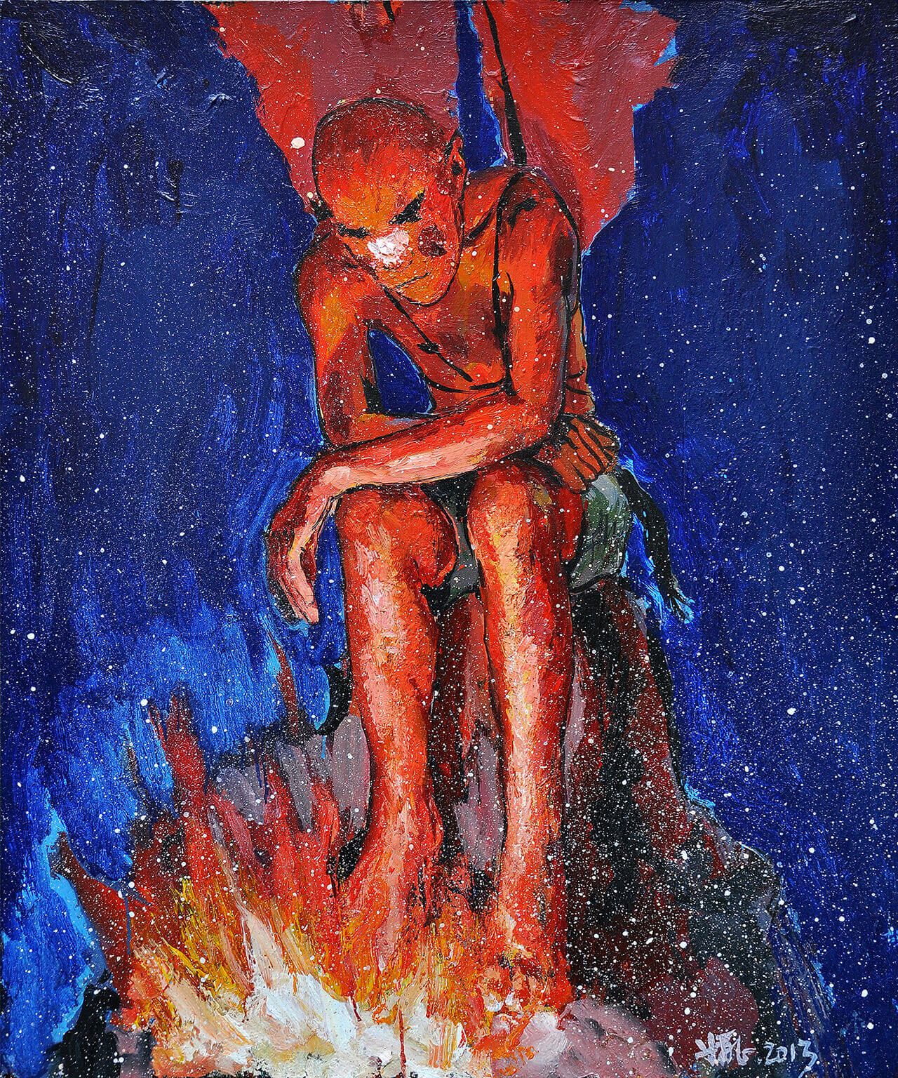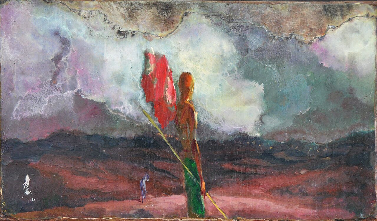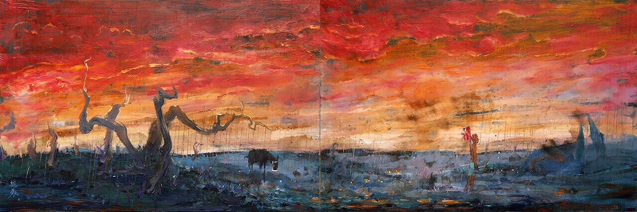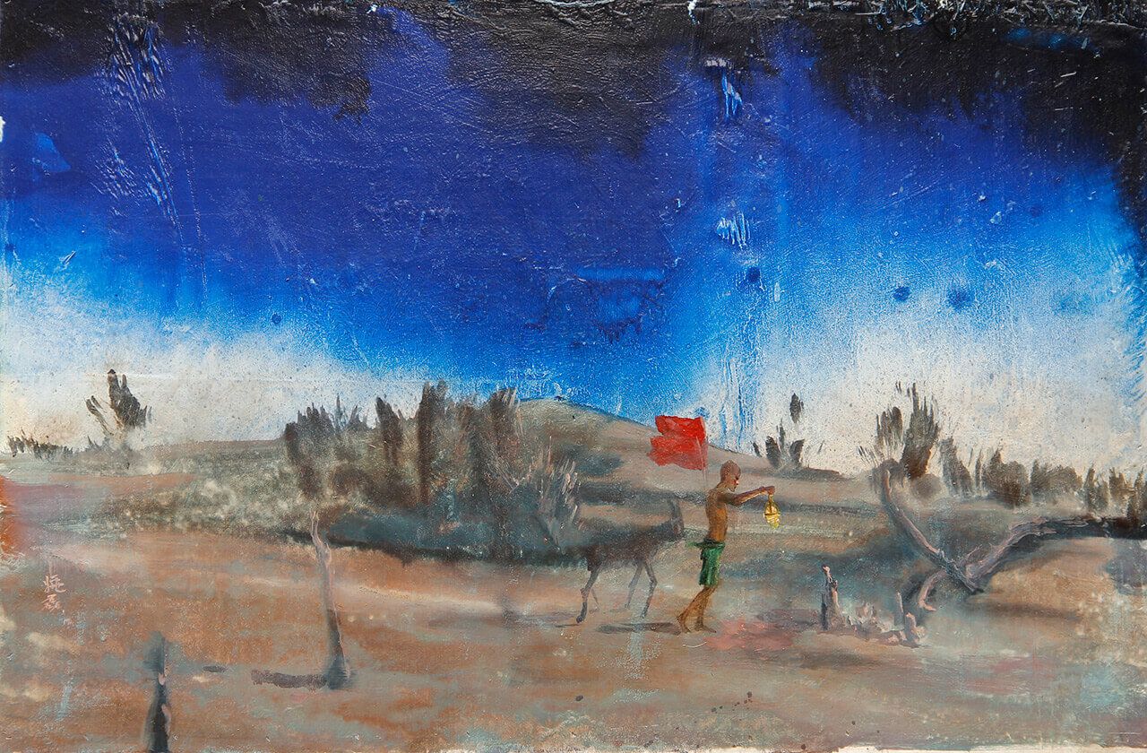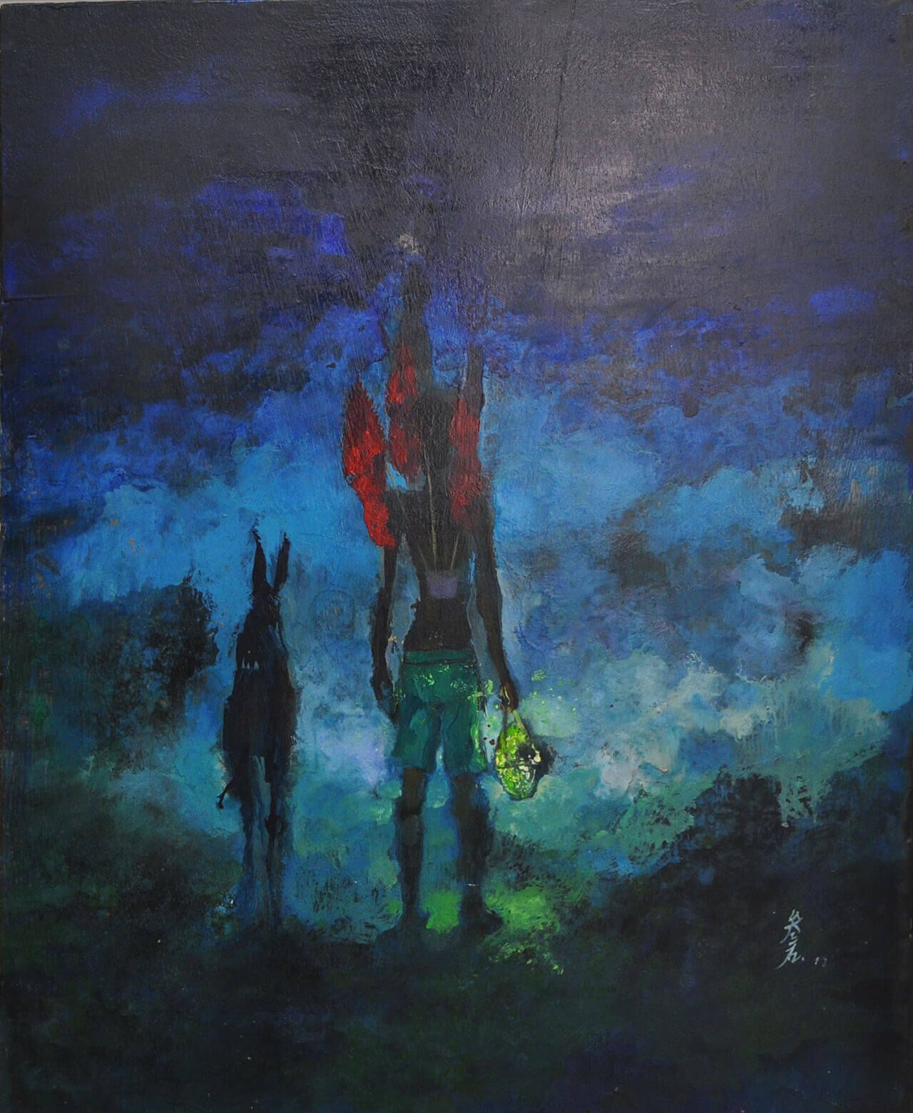 从攻读美术学硕士学位开始,姚磊痴迷并投身于“中国孩子”系列油画创作已经长达5年以上。他的作品有着深邃宽广的隐喻性与强烈的视觉冲击力,其叙事场景多为地域和时代指向都极其模糊的想象空间:在那里,或是群山苍莽、泥淖密布,或是乌云翻滚、雾霭四伏,无论具象场景还是抽象场景,总有一个身背三面小旗、鼻子上一块白粉的男孩在孤独与迷惘当中向着虚无进发。在作品绘制方式上,姚磊采用了汽油燃烧的独特技术。他边烧边画,边画边烧,火焰烤化并引燃油性颜料,形成水墨般自然流淌与相互融和的视觉效果,那些斑驳焦糊的疤痕进一步引发出观看的疼痛与惊惧。这些视觉符号与图像语汇中熊熊燃烧的火焰一起奏响了孤独的荣耀感……