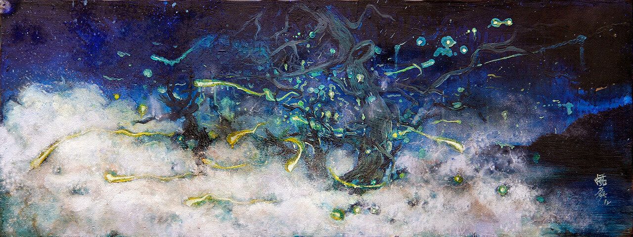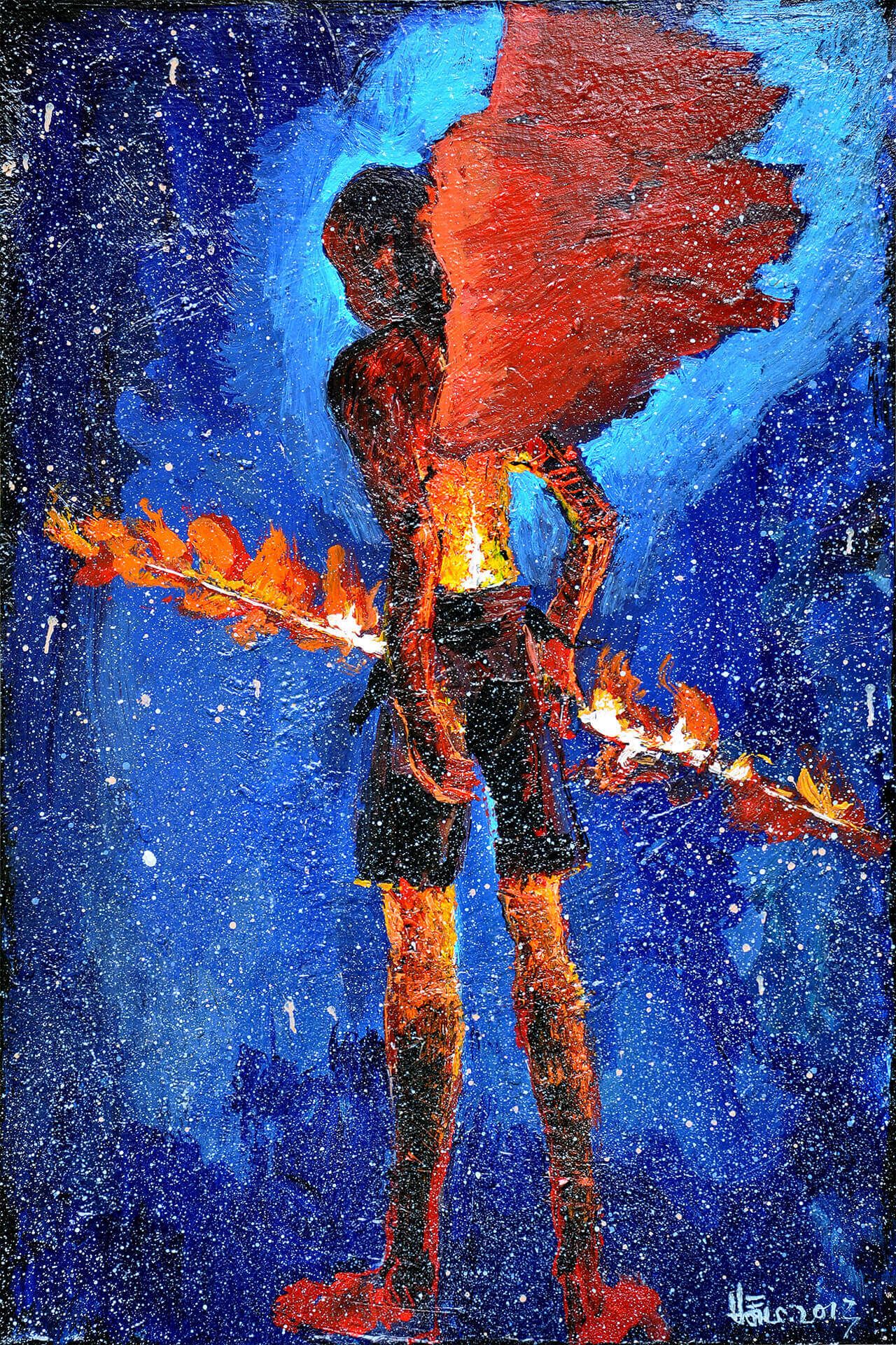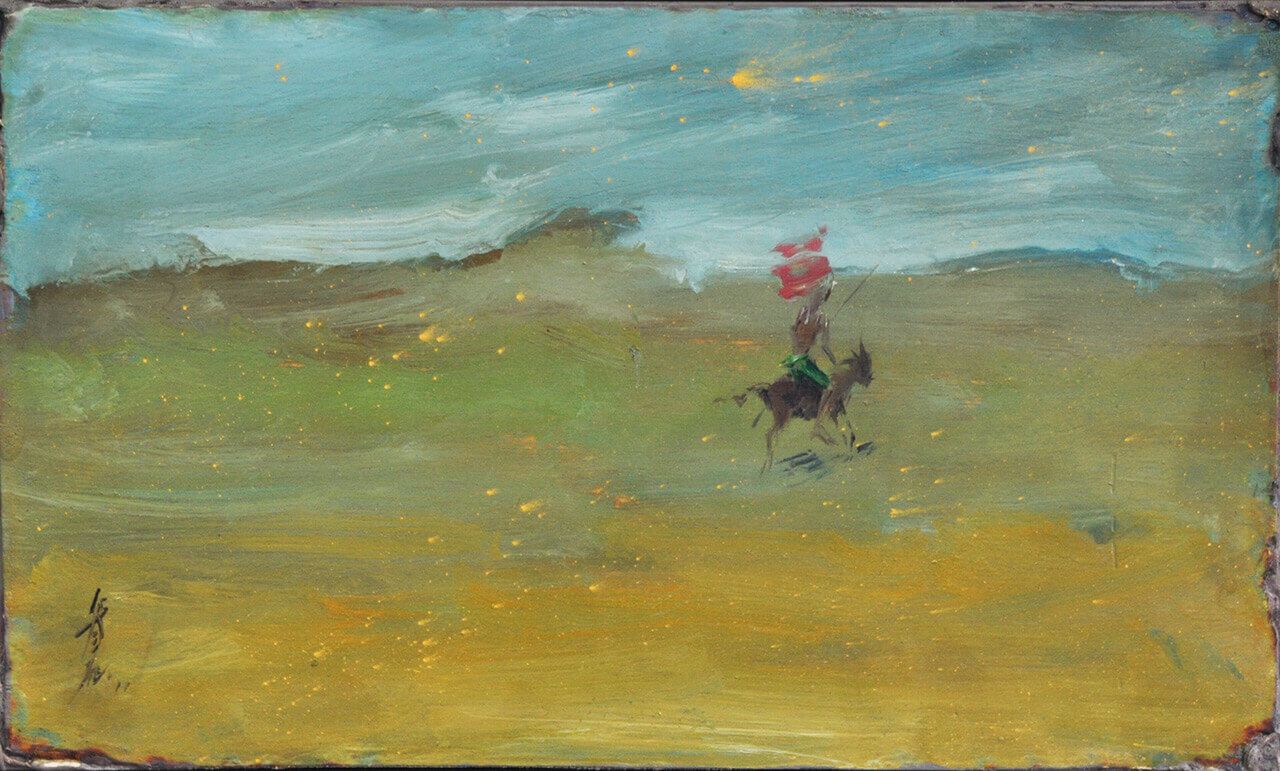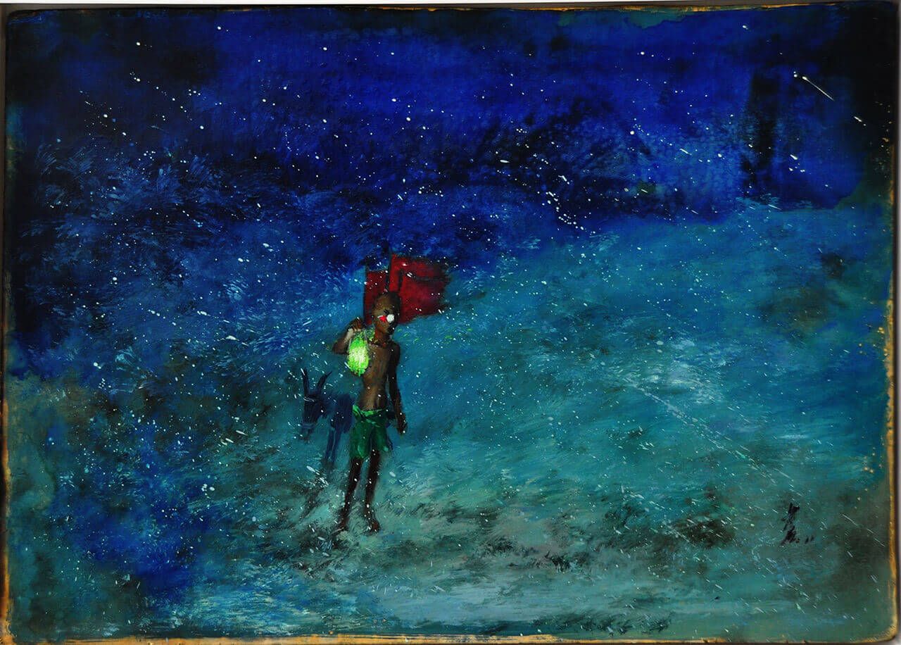 从攻读美术学硕士学位开始,姚磊痴迷并投身于“中国孩子”系列油画创作已经长达5年以上。他的作品有着深邃宽广的隐喻性与强烈的视觉冲击力,其叙事场景多为地域和时代指向都极其模糊的想象空间:在那里,或是群山苍莽、泥淖密布,或是乌云翻滚、雾霭四伏,无论具象场景还是抽象场景,总有一个身背三面小旗、鼻子上一块白粉的男孩在孤独与迷惘当中向着虚无进发。在作品绘制方式上,姚磊采用了汽油燃烧的独特技术。他边烧边画,边画边烧,火焰烤化并引燃油性颜料,形成水墨般自然流淌与相互融和的视觉效果,那些斑驳焦糊的疤痕进一步引发出观看的疼痛与惊惧。这些视觉符号与图像语汇中熊熊燃烧的火焰一起奏响了孤独的荣耀感……