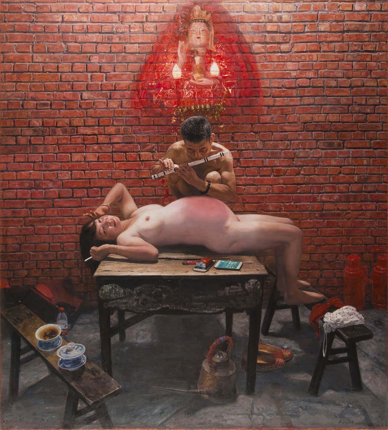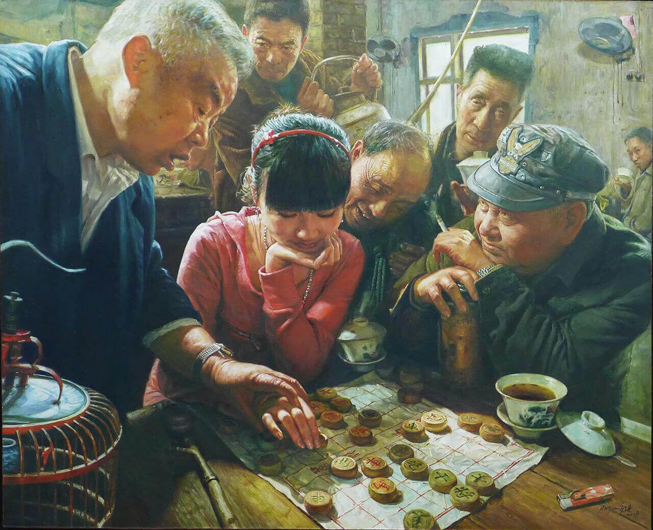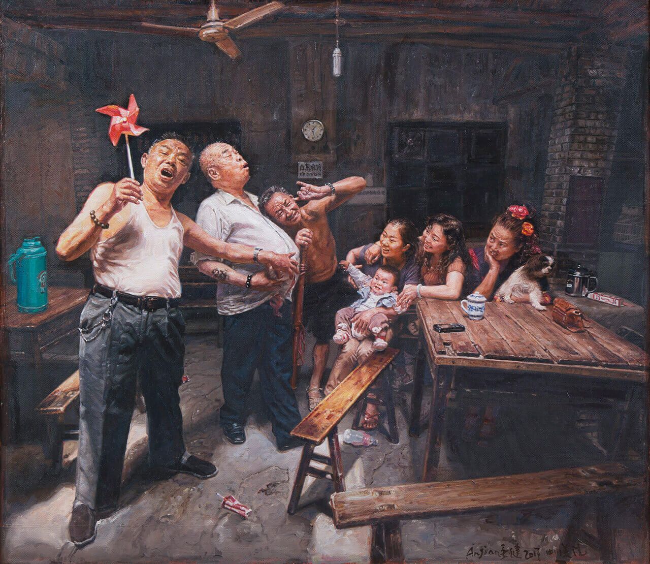 本次汇报展了了作了精心的布置,虽然场面和规模没有去年四月在重庆做的那么公开和盛大,但是在内部细节上依然一点都不敢松懈。画作的呈现不像重庆展览,基本上回顾了艺术家20年的创作历程,这次把大家对《茶馆》关注的重心,放在对将来的期望上,以陈安健先生一到两年最新的作品为主。