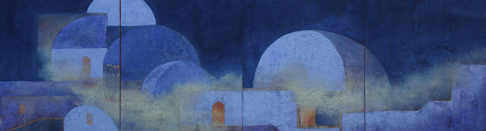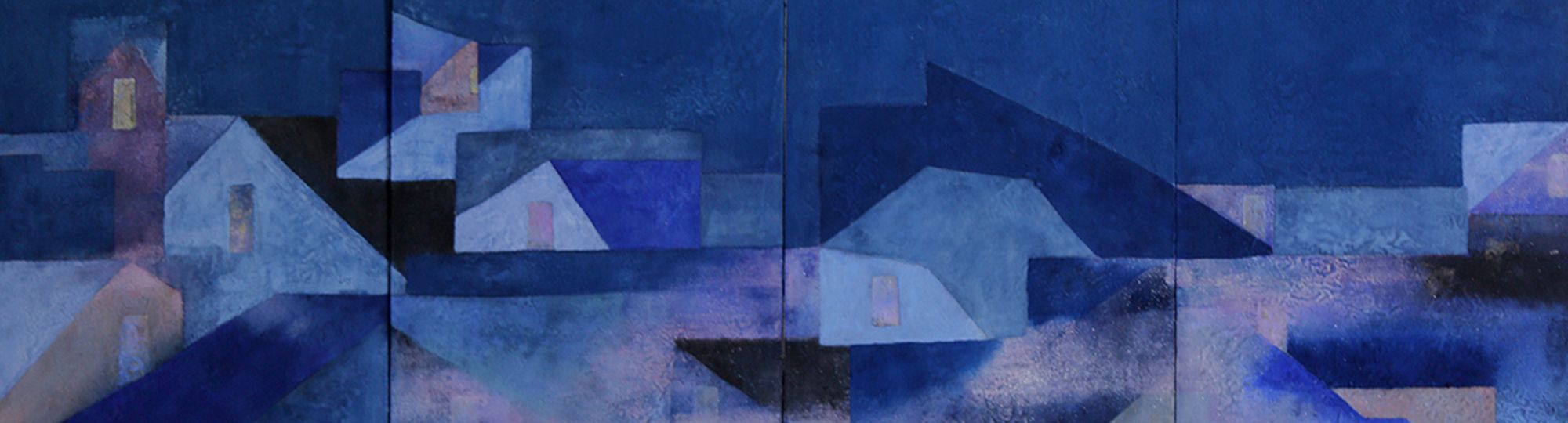 树所带给我的生命感、神秘感与岩彩天然矿石材料、有色砂岩有色土材料发生了潜意识的碰撞。岩彩画的材质来自于大自然,是亿万年地球运动产生的不同材质。这些材质是大自然的馈赠。它们如此的丰富,如此的灿烂,这些蕴含宇宙信息能量和生命密码的自然材质,给人以强大的视觉冲击力及与大自然沟通的想象空间。这两幅树系列的作品是基于此种思考而创作出来的。其中《生长》这幅岩彩作品,我将树枝以对称状的姿态向两端拉扯,以画面中心为能量场朝着两个方向向上生长。《幻像》这幅岩彩作品则相反,树枝朝中心逐渐汇聚产生一种似佛坛影像的幻觉。《无尽密林》这幅岩彩作品创作于2022年上半年。这幅作品可以看做是树系列作品的前阶段。蒲葵由类似于针状的裂片组成,我对其垂落带有冲击感的线条所吸引,遂创作了这幅作品。《城外城》系列作品是19年初创作的。我尝试通过对不同空间虚拟化的处理,把这些空间切割成平面碎片,再进行二次组合形成拼贴式的视觉效果。单看每一个部分它或许都是不完整的,但整体观看,它们又是贯穿一致的。