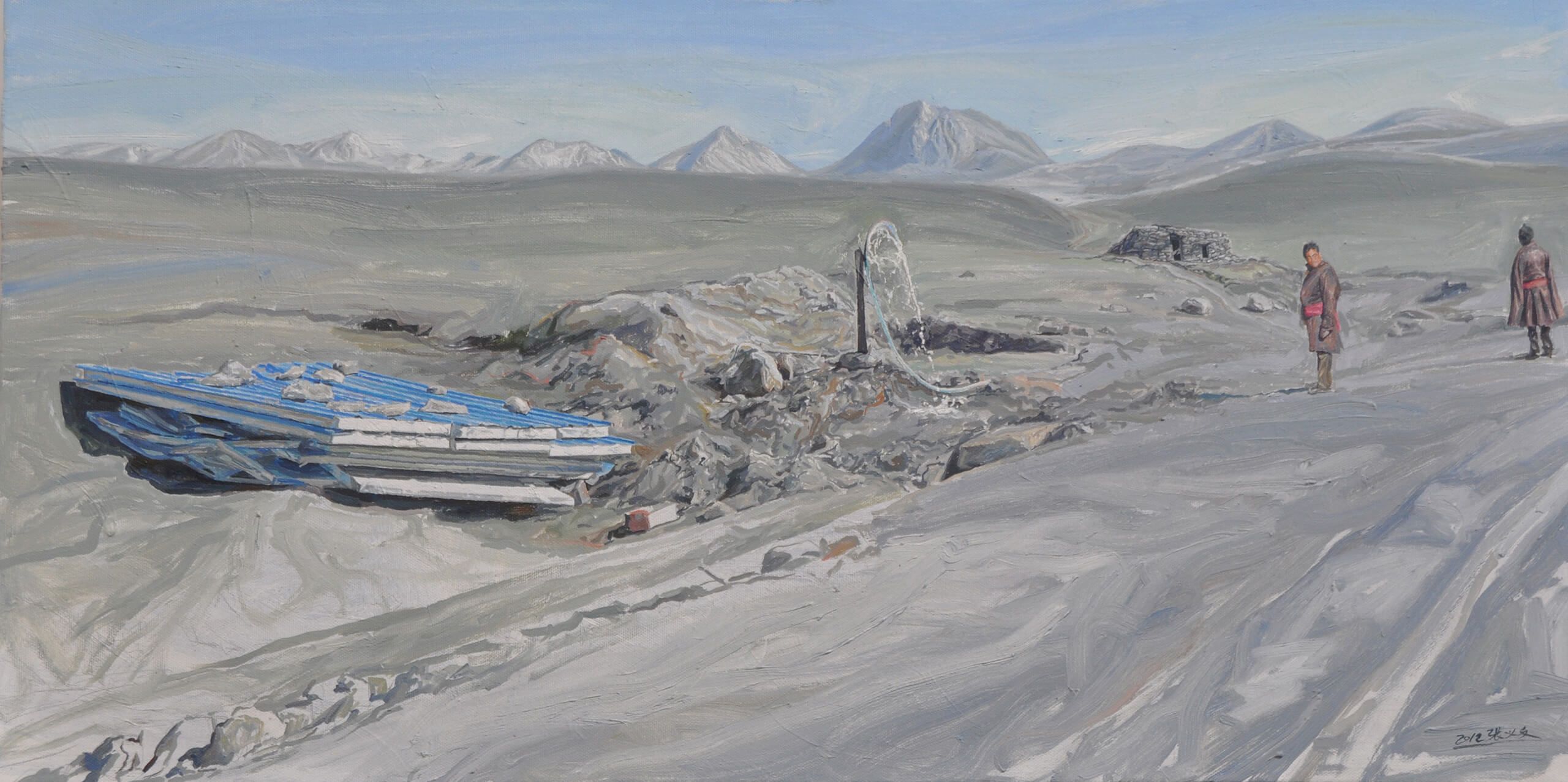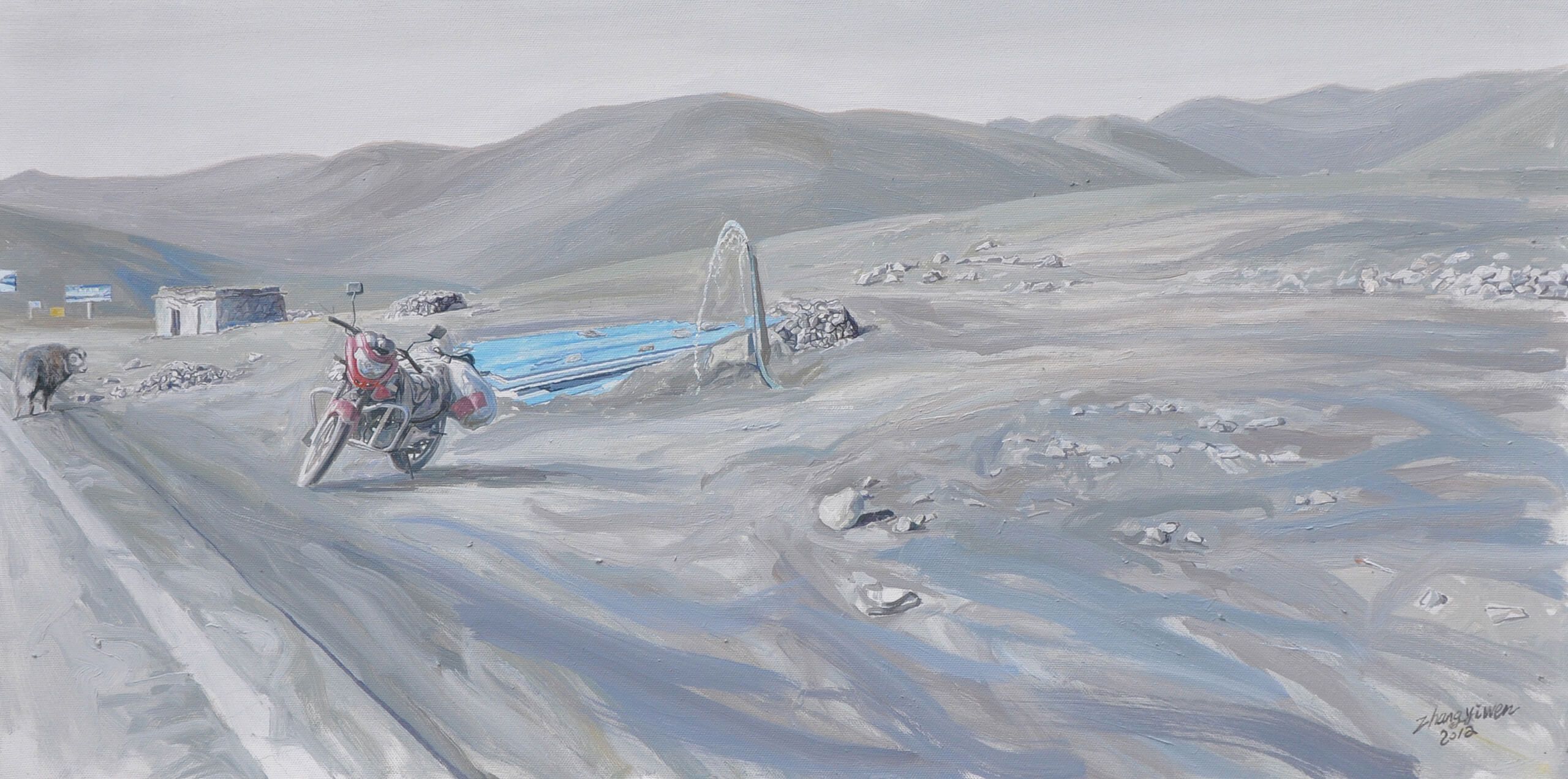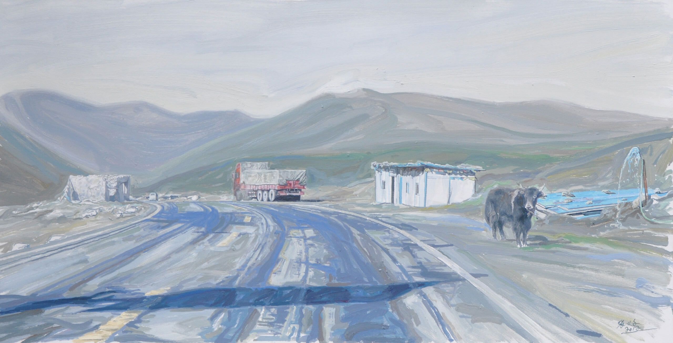 沿318国道,画家张义文走在藏区的公路上。远离大都市,行走在蓝天白云之下,可视野里躲不过的,还是拆拆建建……