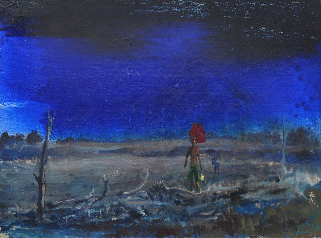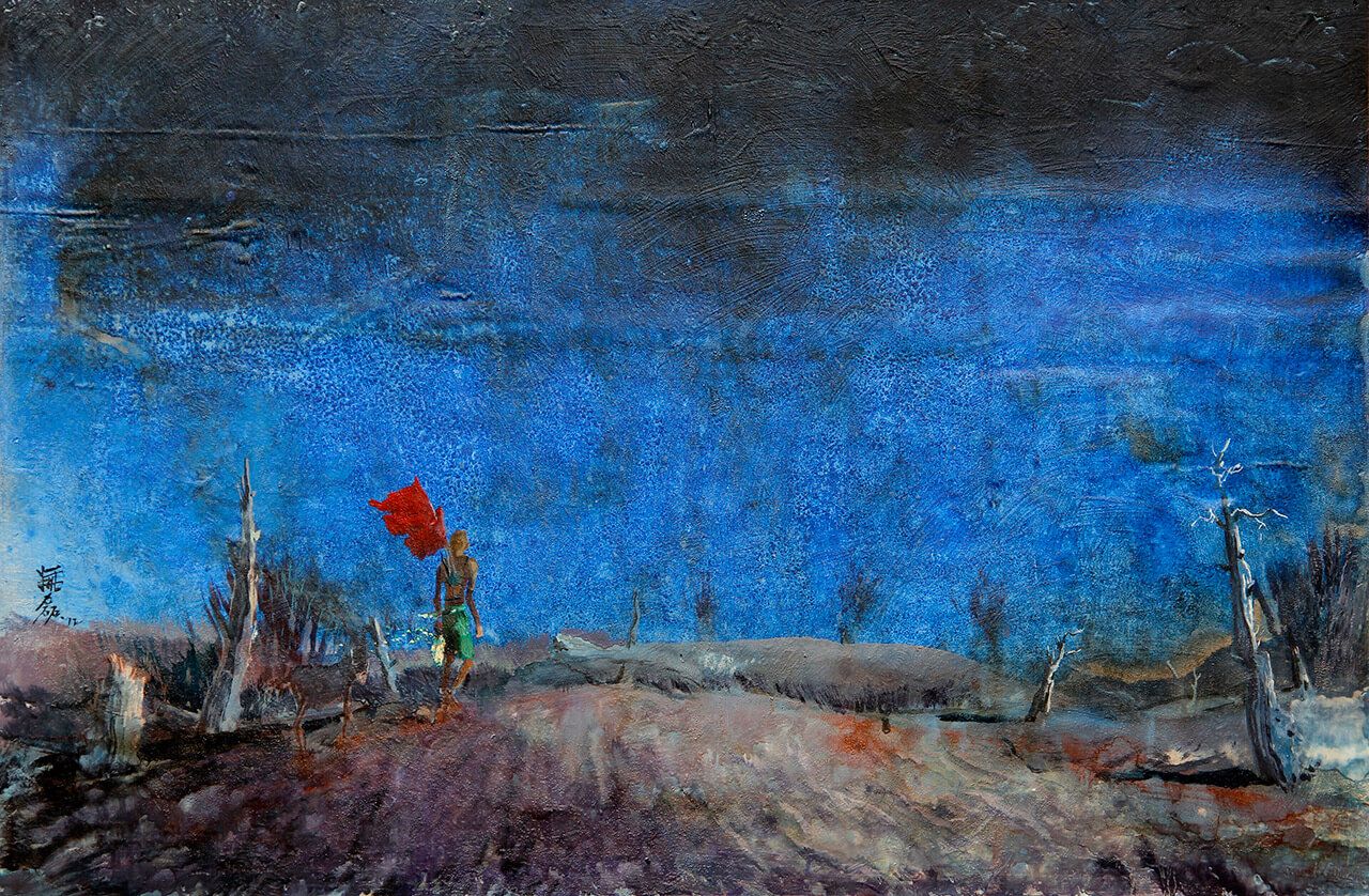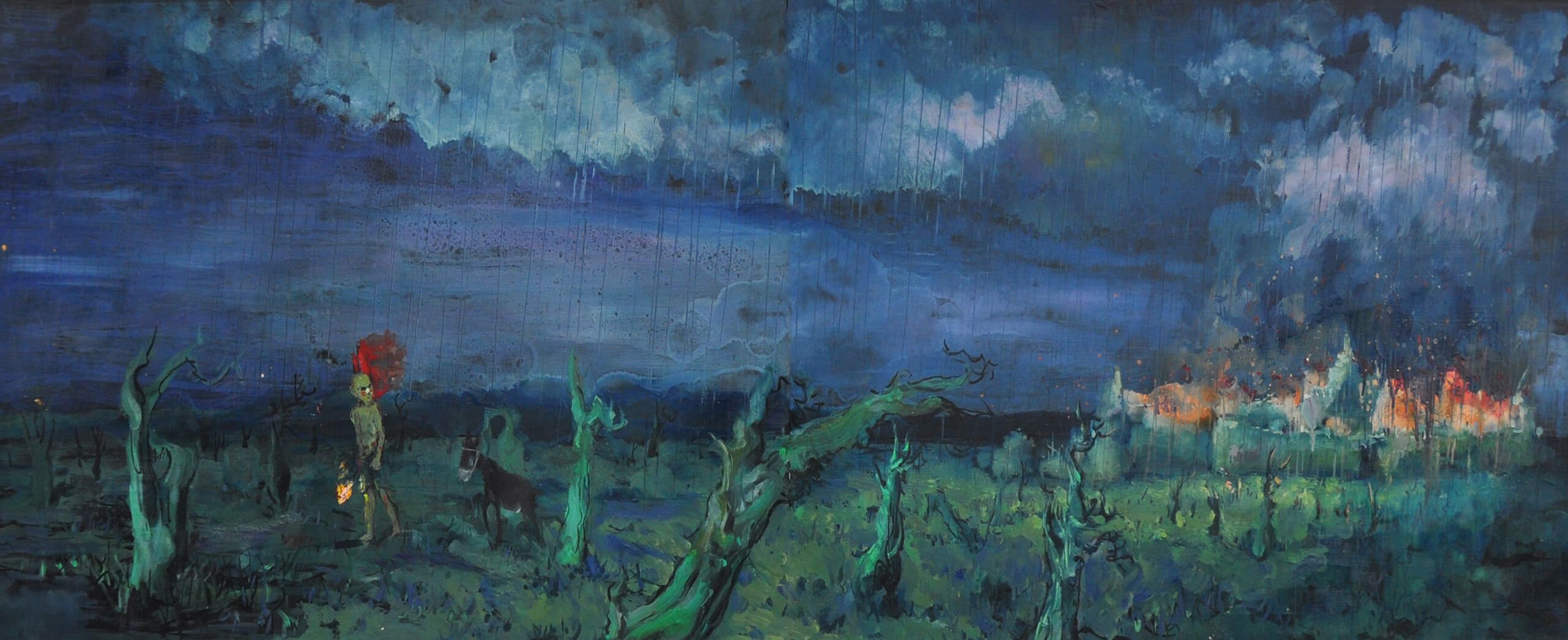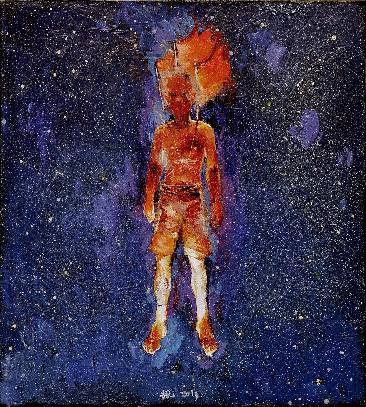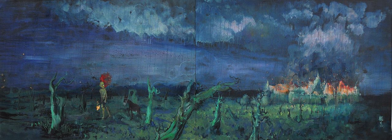 从攻读美术学硕士学位开始,姚磊痴迷并投身于“中国孩子”系列油画创作已经长达5年以上。他的作品有着深邃宽广的隐喻性与强烈的视觉冲击力,其叙事场景多为地域和时代指向都极其模糊的想象空间:在那里,或是群山苍莽、泥淖密布,或是乌云翻滚、雾霭四伏,无论具象场景还是抽象场景,总有一个身背三面小旗、鼻子上一块白粉的男孩在孤独与迷惘当中向着虚无进发。在作品绘制方式上,姚磊采用了汽油燃烧的独特技术。他边烧边画,边画边烧,火焰烤化并引燃油性颜料,形成水墨般自然流淌与相互融和的视觉效果,那些斑驳焦糊的疤痕进一步引发出观看的疼痛与惊惧。这些视觉符号与图像语汇中熊熊燃烧的火焰一起奏响了孤独的荣耀感……
