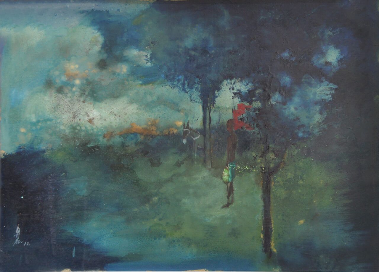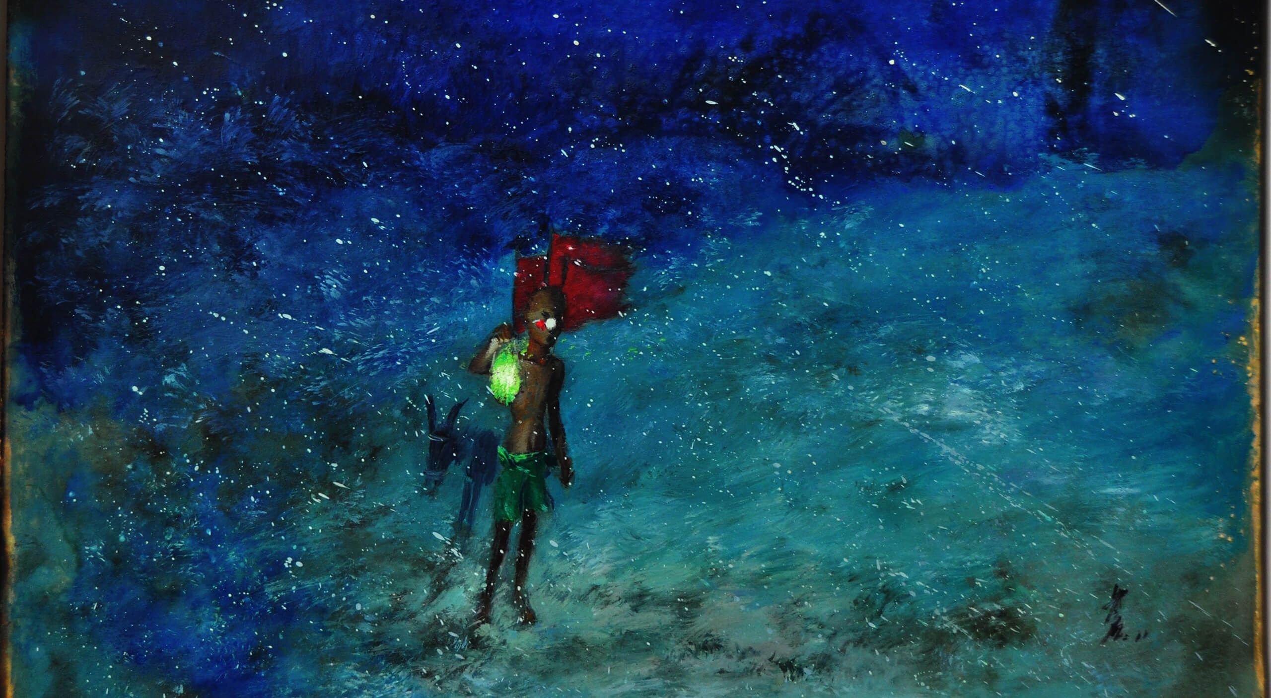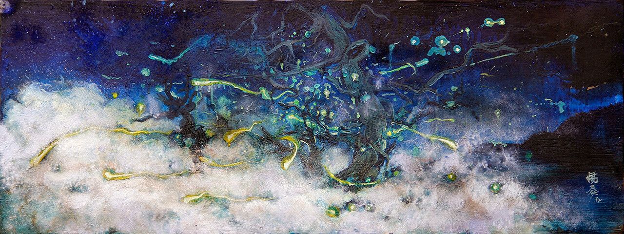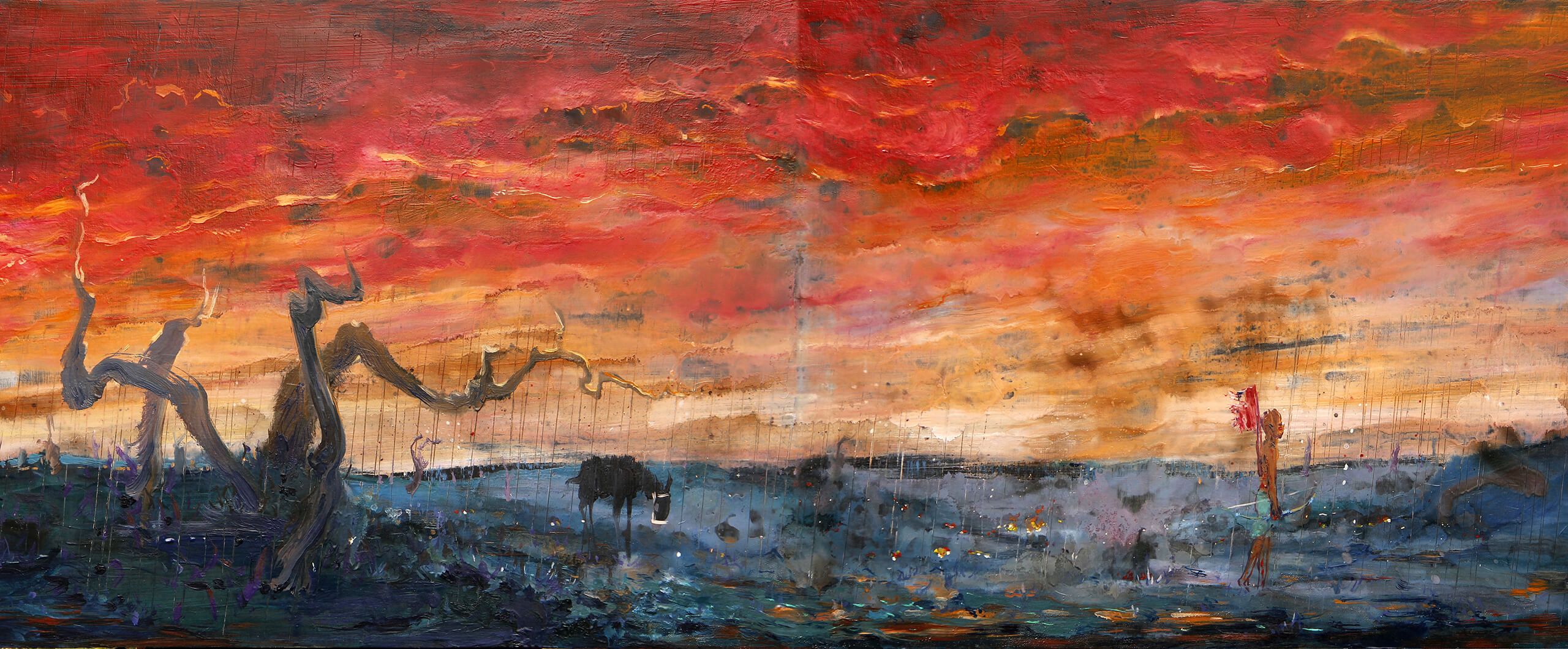 从攻读美术学硕士学位开始,姚磊痴迷并投身于“中国孩子”系列油画创作已经长达5年以上。他的作品有着深邃宽广的隐喻性与强烈的视觉冲击力,其叙事场景多为地域和时代指向都极其模糊的想象空间:在那里,或是群山苍莽、泥淖密布,或是乌云翻滚、雾霭四伏,无论具象场景还是抽象场景,总有一个身背三面小旗、鼻子上一块白粉的男孩在孤独与迷惘当中向着虚无进发。在作品绘制方式上,姚磊采用了汽油燃烧的独特技术。他边烧边画,边画边烧,火焰烤化并引燃油性颜料,形成水墨般自然流淌与相互融和的视觉效果,那些斑驳焦糊的疤痕进一步引发出观看的疼痛与惊惧。这些视觉符号与图像语汇中熊熊燃烧的火焰一起奏响了孤独的荣耀感……