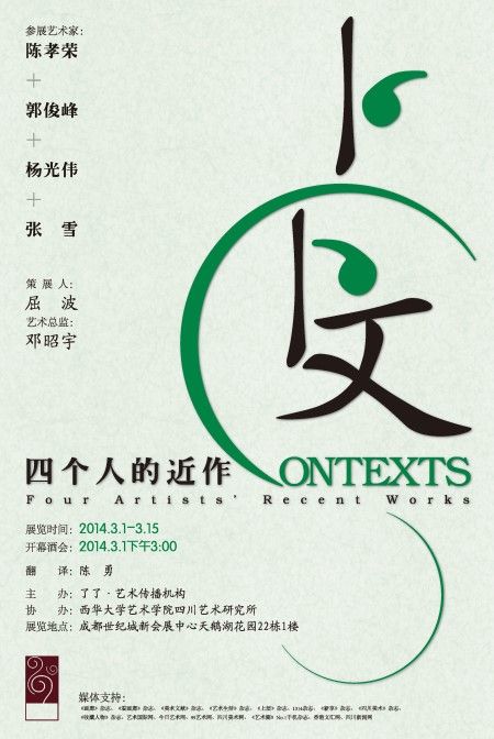 "上下文:四个人的近作"群展定于2014年3月1日(周六)15时,在了了•艺术传播机构1号馆开幕。本次展览将展出陈孝荣、郭俊峰、杨光伟、张雪四位艺术家的作品,涵盖油画、水彩、综合材料三类艺术形式。展览将持续到2014年3月15日。
