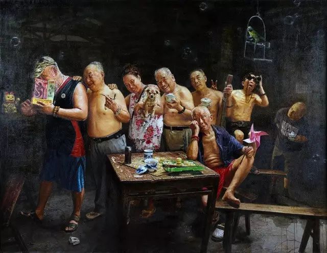 陈安健《茶馆系列-诺贝尔》200×155cm2014年布面油画 参展“中国精神——第四届中国油画展(写实展)”